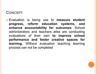 The document discusses different aspects of evaluation in teaching and learning including the concept, meaning, definition, characteristics, principles, types, and steps. Evaluation is defined as the process of making judgments about the effectiveness of teaching and learning based on criteria and evidence. There are different types of evaluation classified by function (formative, summative, diagnostic, placement), approach (criterion-referenced, norm-referenced), and interpretation (formative, summative). Effective evaluation is systematic, continuous, comprehensive, objective, reliable, and valid. It follows the planning, process, and product phases with steps like determining objectives, selecting instruments, and analyzing results.