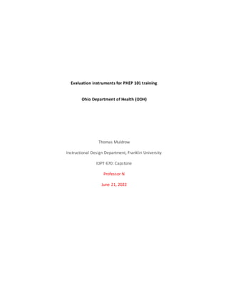The document outlines the development of evaluation instruments for the PHEP 101 training program by the Ohio Department of Health. It includes surveys to measure learner satisfaction, knowledge gain, and self-assessment for emergency response coordinators, aimed at improving the training and its applicability. Multiple appendices detail evaluation components, including feedback forms and testing instruments to assess knowledge before and after training.