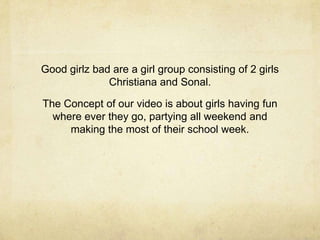 The document evaluates the music video "Good Girlz Bad" by the girl group consisting of Christiana and Sonal. It summarizes the concept of the video showing the girls having fun wherever they go. It also discusses how the video uses characteristics of real music videos like equal face time for both girls. The video effectively combines lyrics and visuals, such as a scene matching the lyrics about a boy hiding a girl. The document reflects on feedback received which noted the simple concept but could improve lighting and reduce repetition.
