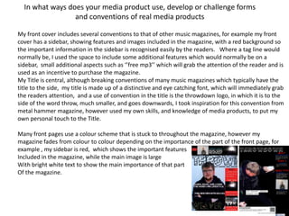 My media product is a music magazine that represents the metal and hardcore music scene. It uses conventions from other music magazines, such as a sidebar with features, but also challenges conventions by having the title in the center of the cover rather than the side. The target audience is males and females aged 15-20 who enjoy music events. It would be produced by a large publisher like Bauer Media Group and aims to attract its target audience through the relevant cover star and competitive monthly price of £2.40.