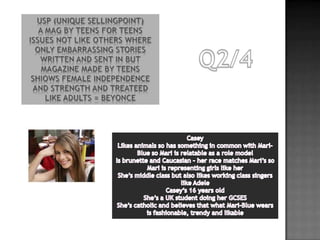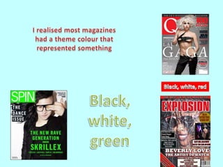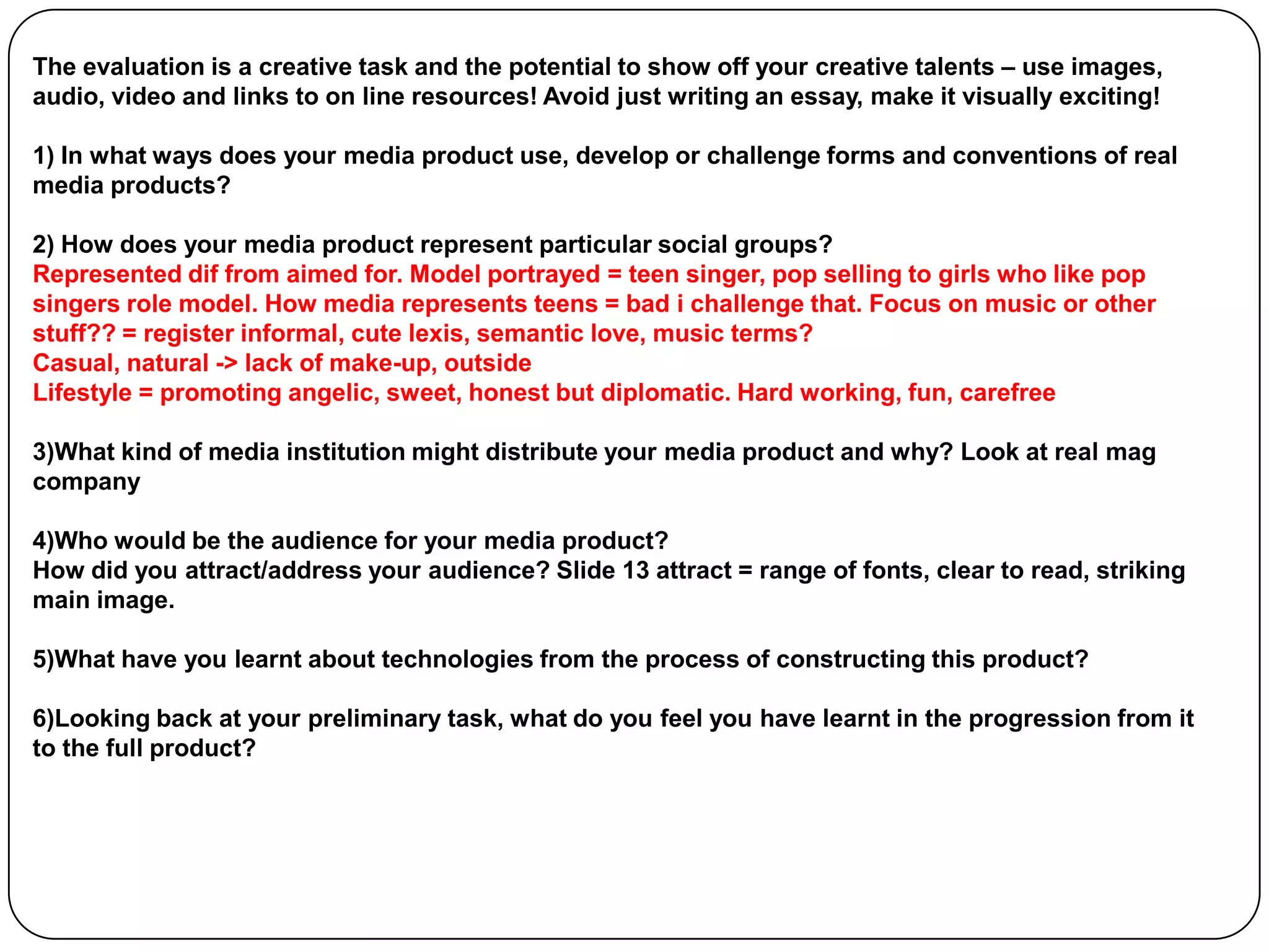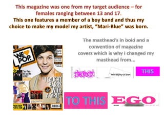 The document summarizes the progression of a student's media magazine project from an initial preliminary task to the full developed product. It notes several ways the full product improved, including limiting colors, having elements like the masthead and contents stretch across the page, including page numbers, filling empty space on pages, and properly placing images. The student demonstrated learning conventions of real magazines and how to make their magazine more visually appealing and organized.