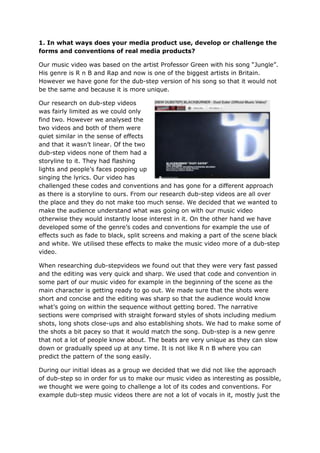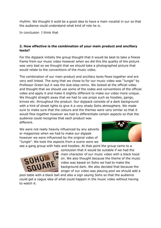 The document discusses the creation of a music video for Professor Green's song 'Jungle' in a dub-step style, differentiating it from typical dub-step videos through its narrative approach and effective editing techniques. Additionally, the combination of the music video with ancillary texts like a digipack and magazine cover is examined, highlighting the use of visual elements and colors that align with the video's theme. Audience feedback indicated strong engagement with the video, although some suggestions for improvement were noted, particularly regarding the use of effects and location choices.