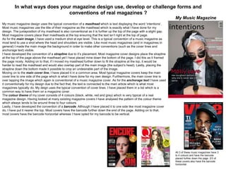 The document discusses the ways in which the author's magazine designs use and develop conventions of real magazines.