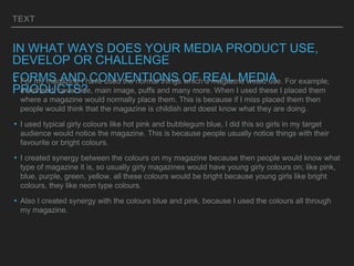 The document discusses a student's media magazine project. It evaluates how the magazine uses conventions of real magazines through elements like placement of masthead, cover lines, and images. It represents teenage girls through its use of bright pink, blue, purple, green and yellow colors. The magazine would likely be distributed by publishers like Bauer and sold in stores frequented by teens such as supermarkets, clothing stores, and pharmacies in order to attract its target 13-16 year old female audience. The student learned valuable skills in Photoshop and about the magazine design process through completing this project.