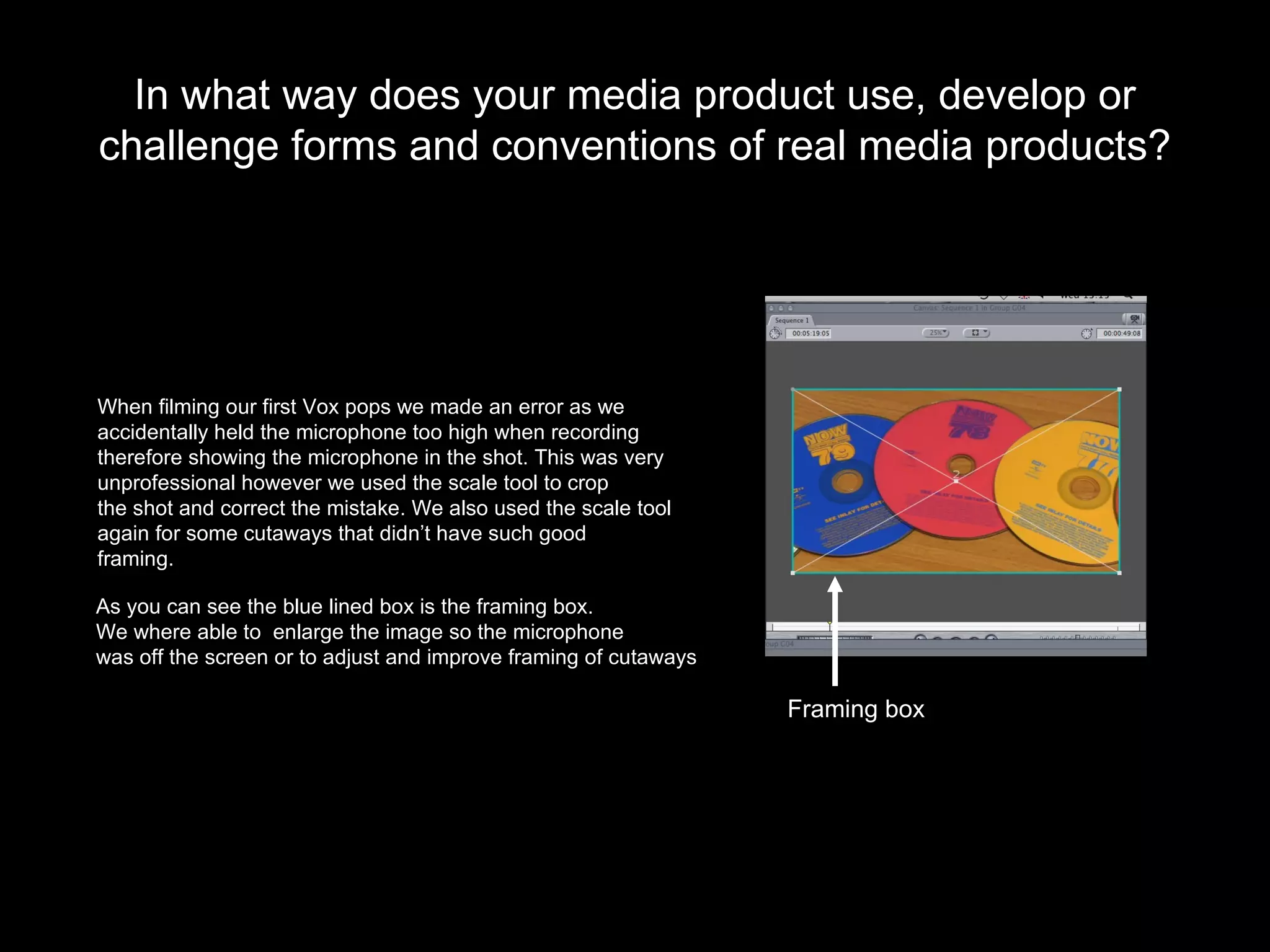 The document discusses various ways the media product challenged conventions of real media products. It did not include transitions typically used in documentaries. It had an off-screen narrator rather than an on-screen one. Vox pops were filmed indoors rather than on the street. It did not include animations to present statistics that many documentaries use.