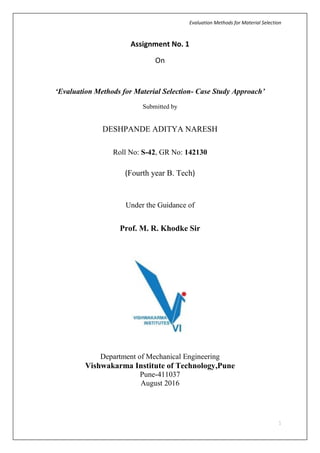 The document discusses evaluation methods for material selection, emphasizing the importance of choosing the right material for various applications based on numerous criteria such as functional and processability requirements, cost, and reliability. It outlines traditional approaches like cost versus performance methods and weighted property indices, and explores the implications of proper material selection on design, highlighting historical failures due to inadequate material properties. A case study on selecting materials for table legs is also included, illustrating practical application of the discussed methods.
