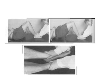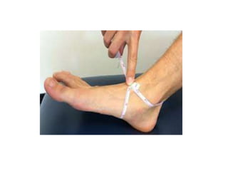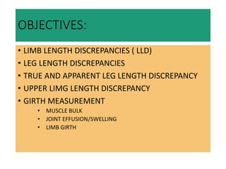 This document discusses various evaluation methods used in physical therapy, including anthropometry and limb length and girth measurements. It defines anthropometry as the scientific study of human body measurements and proportions. Limb length discrepancies, including true and apparent leg length discrepancies, are addressed. Proper techniques for measuring limb lengths, segments, and girth using a tape measure are outlined. The document provides detailed instructions on positioning, landmarks, and measuring various upper and lower body parts.