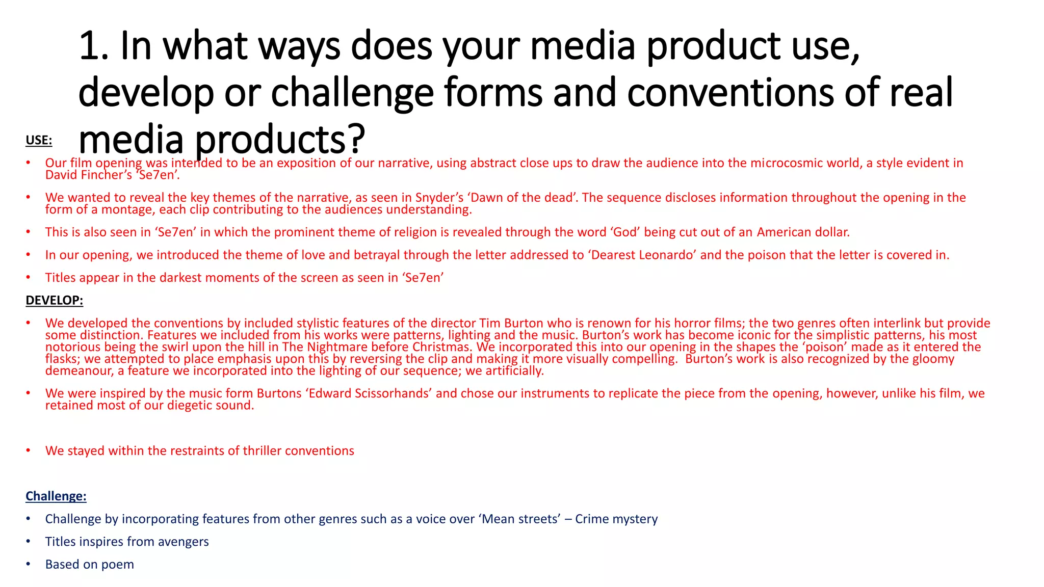 The document provides questions for each member of a group to answer about their media production project. The questions cover various topics such as how their project used or developed conventions from real media, how it represented social groups, what institutions might distribute it, who the target audience is, how they engaged their audience, what they learned about technologies, and what they learned from the preliminary task to the full project. Each group member must answer each question in a different format, such as a video extra, PowerPoint, or blog post with images, to provide visual and designed responses.