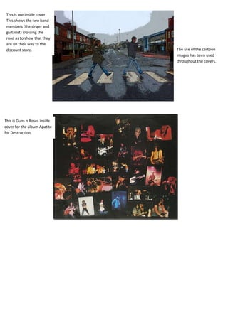 This document discusses and compares the album covers of several popular bands. It describes key elements included on the front, inside, and back covers such as the band and album names, pictures representing the theme or location of the music, and lists of songs. Common design techniques are noted, like using simple backgrounds to make other elements stand out and including continuity between the different sides of the cover through matching art styles or themes.