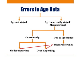 This document discusses various methods to evaluate the accuracy of age data, including errors in reported ages. It describes Whipple's Index, Myer's Index, Age Ratios, Age Ratio Scores, Age Specific Sex Ratios, Sex Ratio Scores, and the UN Joint Score. These indices are calculated using population data to identify issues like digit preference, under-enumeration of certain age groups, and inconsistencies in age and sex ratios that indicate errors in the age data. Graphs and examples from India's 2011 census are provided to illustrate the application and interpretation of these evaluation methods.