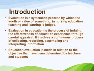 Evaluation is a systematic process to judge the value or worth of teaching and learning in nursing education. It involves collecting, analyzing, and interpreting information on student performance and growth to determine if educational objectives are being achieved. There are two main types of evaluation - formative evaluation which provides feedback during instruction, and summative evaluation which determines achievement at the end through tests and projects. Both qualitative and quantitative techniques are used for evaluation.
