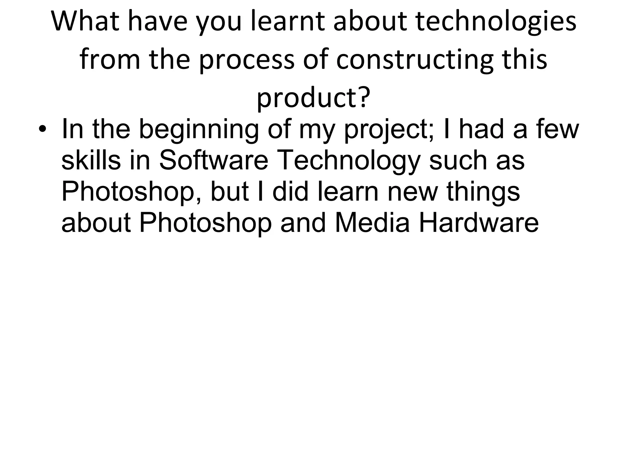 Jack learned several new technologies through constructing his final product. He gained experience using a digital camera for the first time by learning how to adjust the focus lens, properly position the camera on a tripod, and capture images while looking at the screen rather than through the lens. In Photoshop, Jack learned how to add effects like bevel, emboss, and shadows to text and how to digitally edit lighting and contrast.