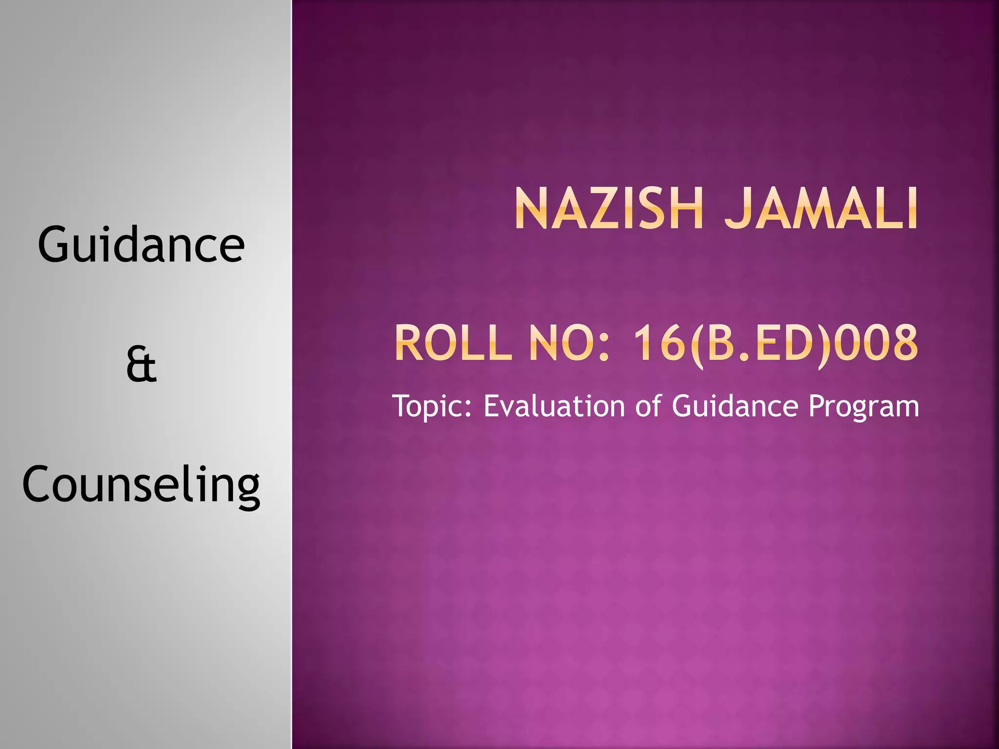 The document discusses the evaluation of guidance programs. Evaluation is a critical part of developmental guidance and counseling programs. It determines the value and effectiveness of the program and its activities in order to make decisions about the future. Evaluation measures service delivery and outcomes to ensure continuous improvement. It aims to determine the program's impact, whether goals are being achieved, identify effective and ineffective parts, and establish goals for counselor development. Evaluation provides objective evidence about whether the program met its desired objectives and allows for program planning and decision-making.