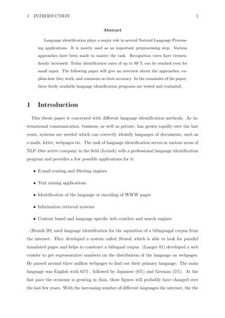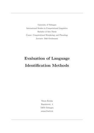 This document provides an overview of different language identification methods. It summarizes three main approaches: (1) common words and unique letter combinations, (2) a statistical approach using Markov models introduced by Ted Dunning, and (3) an N-gram approach introduced by Cavnar et al. For each approach, it provides a brief explanation of the methodology and discusses evaluation results from relevant studies. The document serves as an introduction to language identification methods to be tested on three freely available language identification programs in subsequent sections.