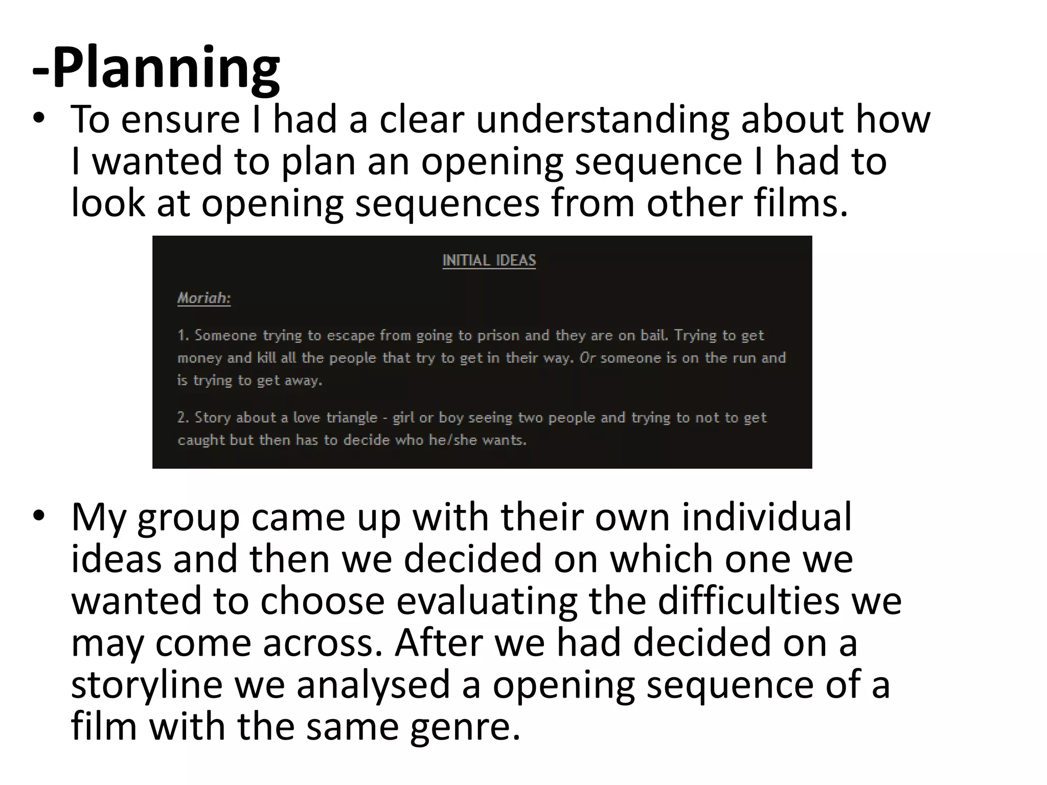 - The document discusses Moriah Johnson's evaluation of their main task to plan an opening sequence for a film. They researched other films' openings, planned with their group by developing ideas and choosing one concept. They conducted focus groups to determine the target audience. The findings helped shape their film to appeal to younger viewers. Their experience planning preliminarily helped them address challenges for the main task. Their final product represented a social group through features like ethnicity, age, and stereotypes.