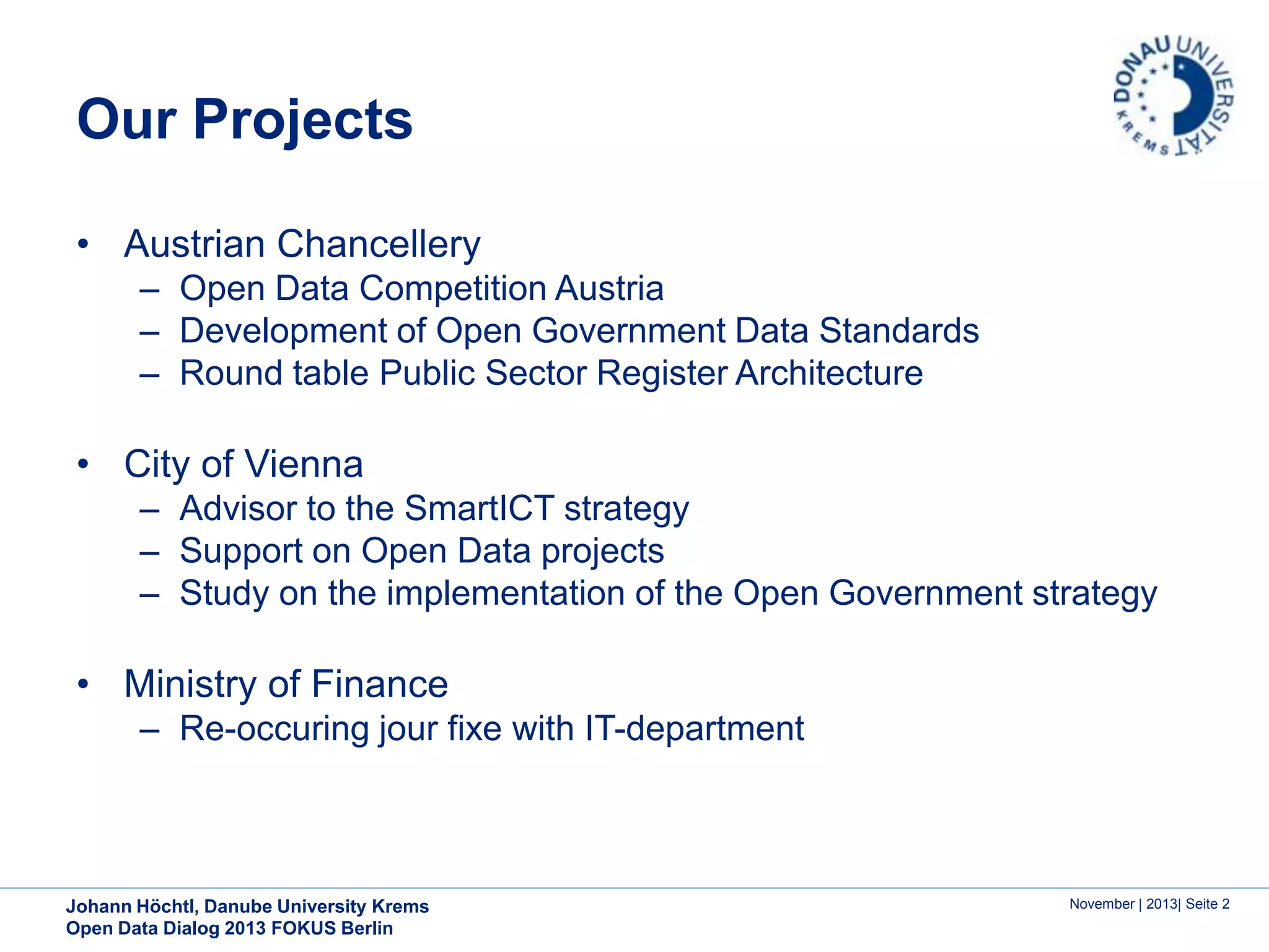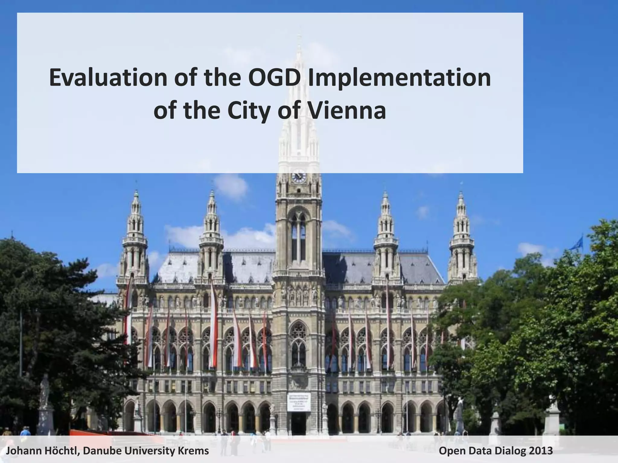 The document summarizes an evaluation study of the Open Government Data (OGD) implementation efforts of the City of Vienna. The study included interviews with municipal departments, citizens, businesses, researchers and journalists in 2012. In 2013, a workshop was held with heads of municipal departments to discuss increasing data supply and novel publication methods. Key findings included that departments saw value in OGD but faced resource constraints, while stakeholders wanted improved data access and harmonization. Recommendations focused on integrating OGD into broader open government strategies, improving data infrastructure and public relations, and addressing incentives and skills.