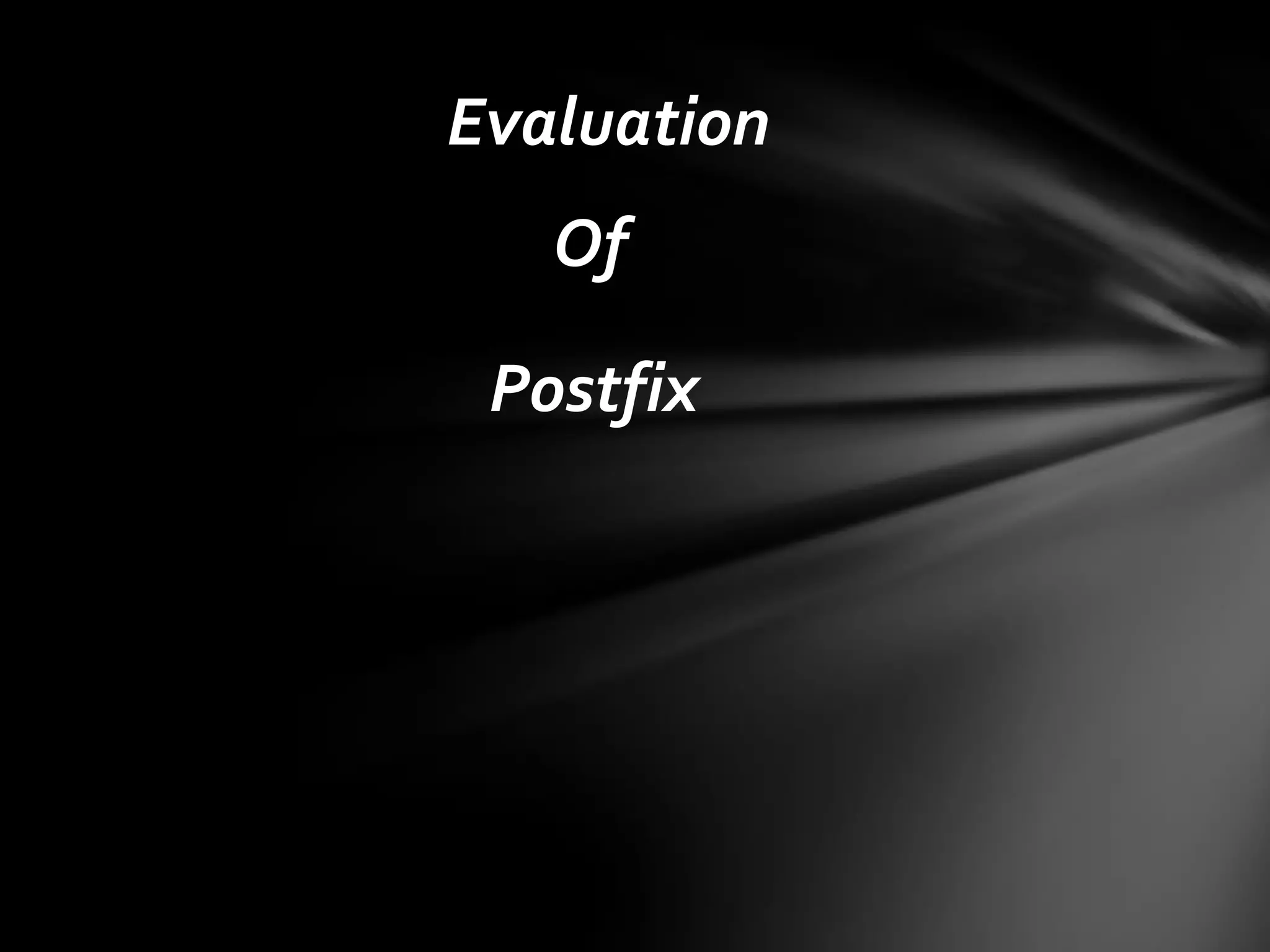 This document discusses postfix notation for evaluating mathematical expressions. It begins by explaining that postfix notation, also called reverse polish notation, writes operators after their operands. It then covers the precedence of operators in postfix notation and the fundamental principles of evaluating a postfix expression using a stack. Key advantages of postfix notation are that operator precedence is unnecessary and the order of evaluation is determined by the position of operators and operands. An example is provided to demonstrate how to manually evaluate a postfix expression step-by-step using a stack.