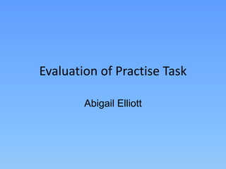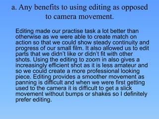 The document summarizes a student's evaluation of their practice task filming assignment. It discusses how editing was beneficial compared to camera movements, how steady the camera work was as they were just starting to learn, and that the narrative was clear enough though a voiceover may have improved it. It also outlines the planned elements of mise en scene, basic camerawork techniques used along with a match on action, and using the video camera for sound. Minor additional editing effects like music were included to set the mood without words.