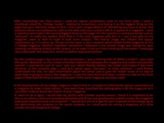 The document summarizes the student's process for developing a preliminary task of designing a college magazine cover and contents page. The student followed typical magazine conventions like using a masthead, slogan, coverline, central image focusing on a student's eyes, and barcode. For the contents page, the student included a relating title, words to create a friendly tone, and buzzwords to draw attention. The student learned following conventions helps make the magazine look realistic, and better photography quality would improve realism.