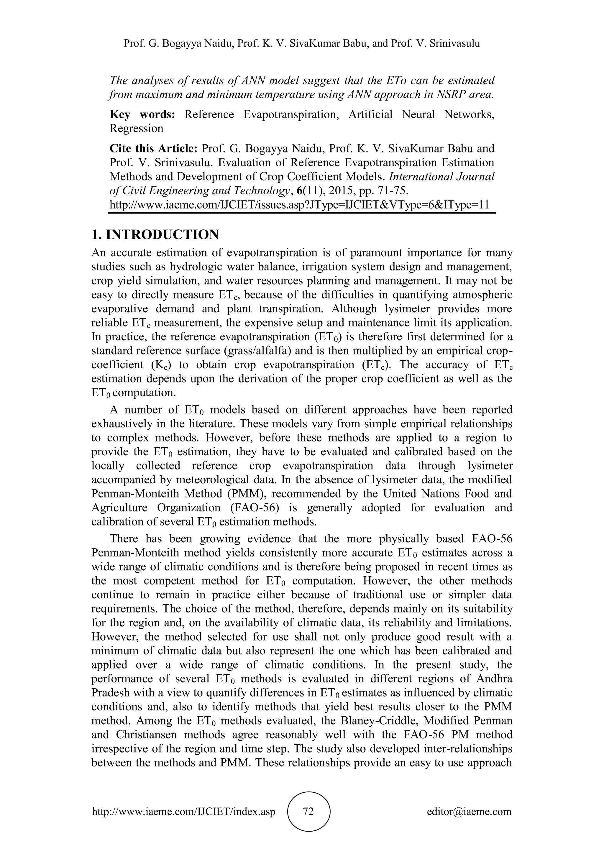This study evaluates various methods for estimating reference evapotranspiration (ETO) in the Nagarjuna Sagar Reservoir area of Andhra Pradesh, comparing four climate-based methods against the FAO-56 Penman-Monteith method. The research found that artificial neural networks (ANNs) outperformed these methods in accuracy when estimating ETO from climatic variables. Additionally, it developed crop coefficient models for different crops, suggesting that locally calibrated parameters can lead to more accurate estimations of crop evapotranspiration.