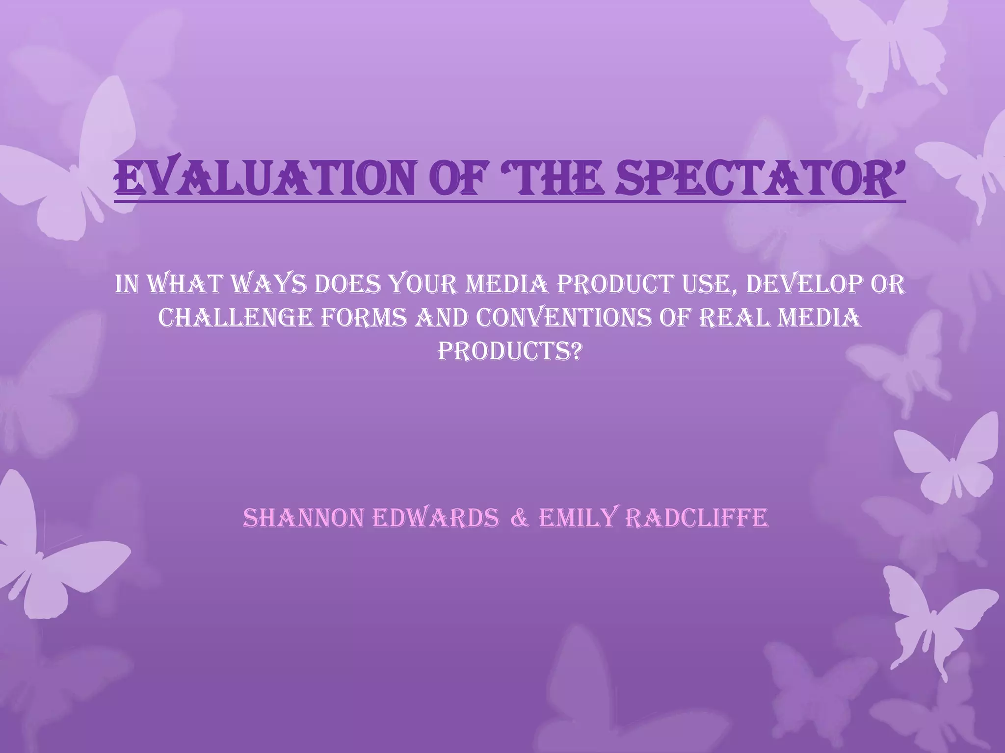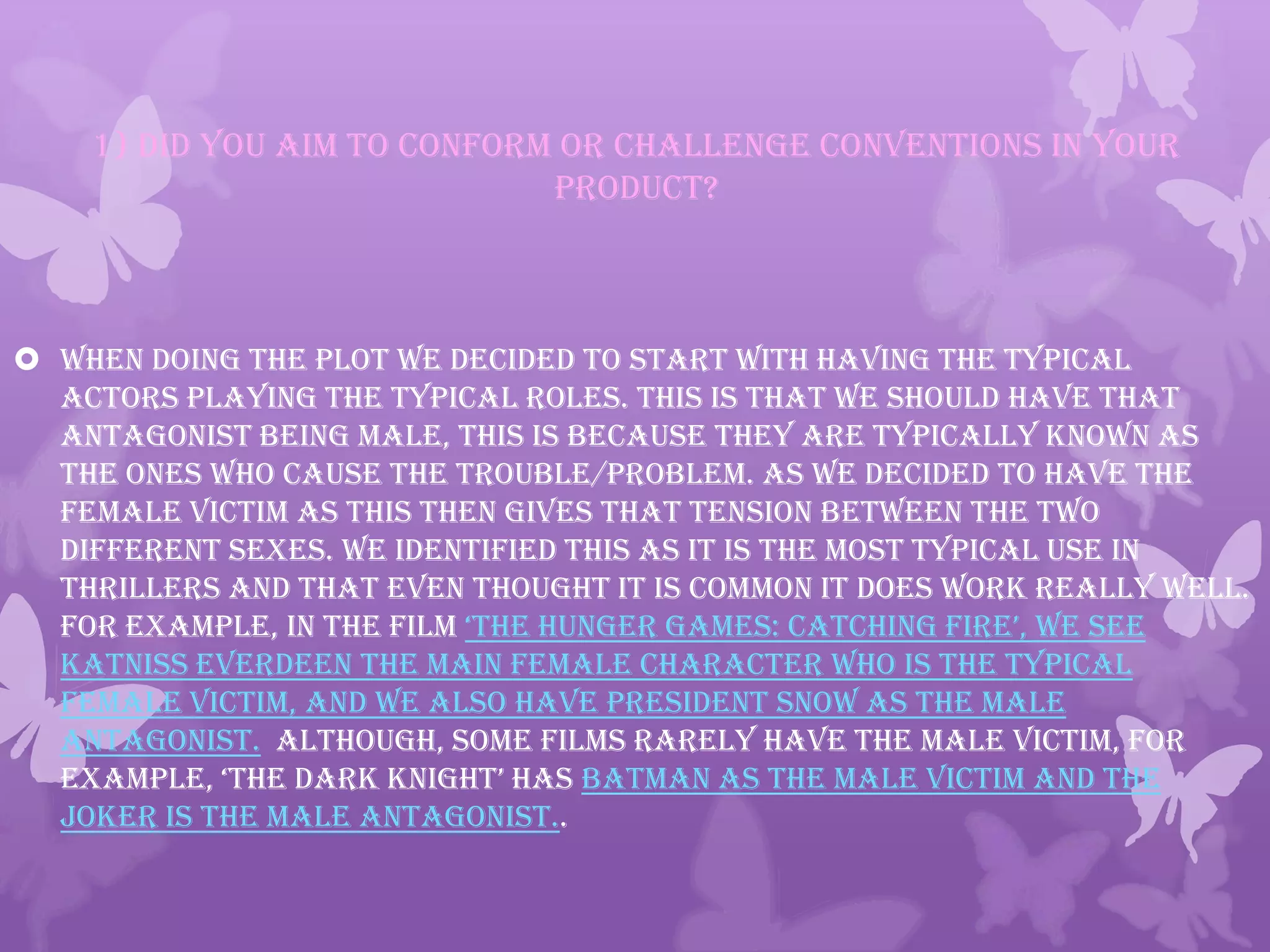 The document discusses the conventions used in the student's media product "The Spectator" and how it conforms and challenges conventions of real thriller films.