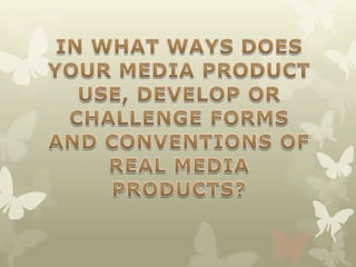 The document analyzes conventions in pop music videos through examples on YouTube. It discusses common techniques like shooting in green rooms, using flashy effects, following artists with cameras, including dance numbers and backup dancers, using bright lighting and costumes. It also notes how the analyzed music videos informed the creation of the author's own music video, which aims to have a bright atmosphere through editing while also challenging some conventions by de-emphasizing locations and having more modest costumes.