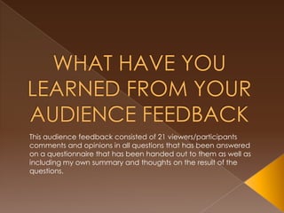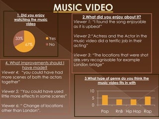 This document summarizes the feedback from 21 viewers who completed a questionnaire about a music video. When asked what they enjoyed, viewers cited the upbeat song, good acting, and recognizable London locations. Suggested improvements included adding more scenes of the actors together and using more visual effects. Most viewers identified the genre as pop or R&B. The document also summarizes feedback on a CD and advertisement, finding that while opinions varied, most viewers enjoyed the overall look. Suggested improvements included better pictures on the CD and a more stylish font for lyrics.