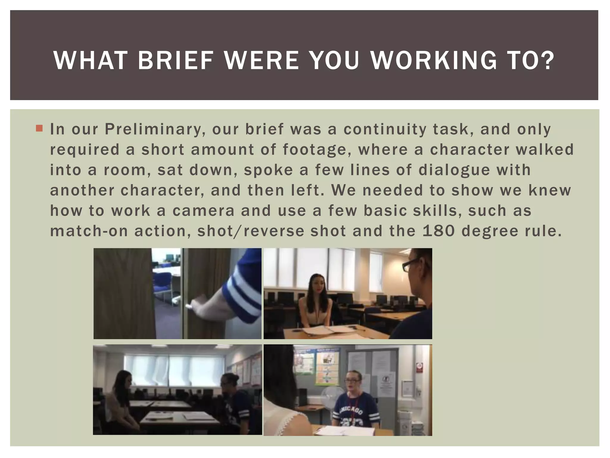 In their preliminary task, the students shot a short scene using a basic camcorder. For their final film, they had more freedom and used a more advanced camera. They learned how to use different camera settings, angles, and shots. They also improved their editing skills in Final Cut by learning more tools and getting better at managing their time. While they carried over techniques like match-on-action from the preliminary, they developed their skills in areas like camera operation, shot variety, and moving shots.
