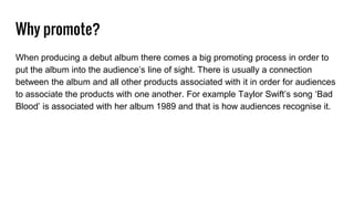 The document discusses the effectiveness of connecting a main product like an album to ancillary products like music videos, posters, and digipaks. It analyzes how artists like Taylor Swift, Drake, and Ed Sheeran connect their different products through consistent branding elements like color schemes while also allowing for variety. The author's own ancillary products - a poster and digipak for a music video - have related but different designs, inspired by other artists, to appeal to wider audiences while still linking the products to the featured artist, Mike Swanson.