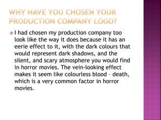 The document discusses appropriate media institutions to distribute a horror film media product. It suggests that Lionsgate Films would be a good choice as they have successfully distributed similar horror films in the past. Lionsgate and other production companies provide necessary resources like studios and makeup to filmmakers. Film distributors take on the important role of marketing and advertising movies to exhibitors and audiences to ensure the film reaches its target demographic. Investors are also discussed as a major source of funding for films, with larger budgets allowing for better advertising and production quality.