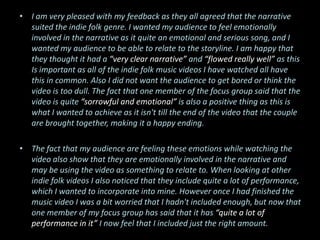 The feedback from test audiences was positive, with most agreeing that the narrative of the indie folk music video suited the genre. The video was described as having a clear narrative that flowed well and elicited emotional responses from viewers. One area for improvement was noted with a cut in scenes that didn't flow continuously; however, the audience still understood the overall narrative. The test audiences also found the mise-en-scene and locations used in the video to be realistic and engaging.