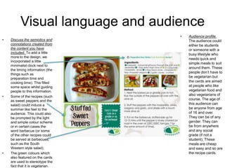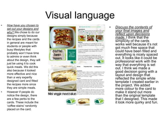 The document discusses the design choices for a set of recipe cards. It was chosen to have a simple, clean design that reflected the quick and easy nature of the recipes. Coffee stains were added for visual interest. Feedback helped improve the design by making it more appealing and professional looking. The finished cards matched the brief of having an interesting theme (quick meals) run throughout. The process taught skills like Photoshop and improved design abilities that can be applied to future projects.