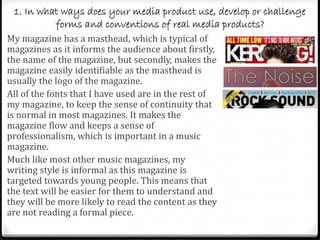The document discusses the technologies used to construct a media product. The creator used Microsoft PowerPoint to plan presentations, SlideShare to upload presentations online, and Blogger to present work. Photoshop was used to create the final magazine pages. The creator learned how to use themes, shapes, and transparent images in PowerPoint. Blogger allowed work to be organized and accessible online. SlideShare easily embedded presentations. OneDrive provided online storage. The creator's first time using Photoshop helped them learn how to create magazine pages. Overall, the creator gained experience with online presentation, storage, and design software through constructing this media product.