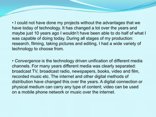 The student used a variety of new media technologies throughout the different stages of their media projects. During the research and planning stage, they were able to access resources like YouTube, Trailer Addict, IMDB, Wikipedia, and magazine websites from their computer to gather influences and information. For filming, they used the school's video camera and a tripod. Digital photography was used to take photos for the poster and magazine cover. Editing software like iMovie, Photoshop, and Garageband were used to edit the teaser trailer, poster, and magazine cover. Some challenges included poor audio quality on the video camera and limited lighting and title options, but the student was able to work around these issues.