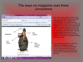 The magazine uses many typical conventions of real music magazines, such as having a rapper on the front cover, bold writing, and a masthead. However, it challenges conventions by not including pull quotes on the front cover stories. The contents page follows conventions like featuring a main article image and page numbers but could develop the use of different fonts. Double page spreads also use conventions like columns, bold colors, and an introduction, though another image could make the spread more eye catching. The target audience is young music fans.