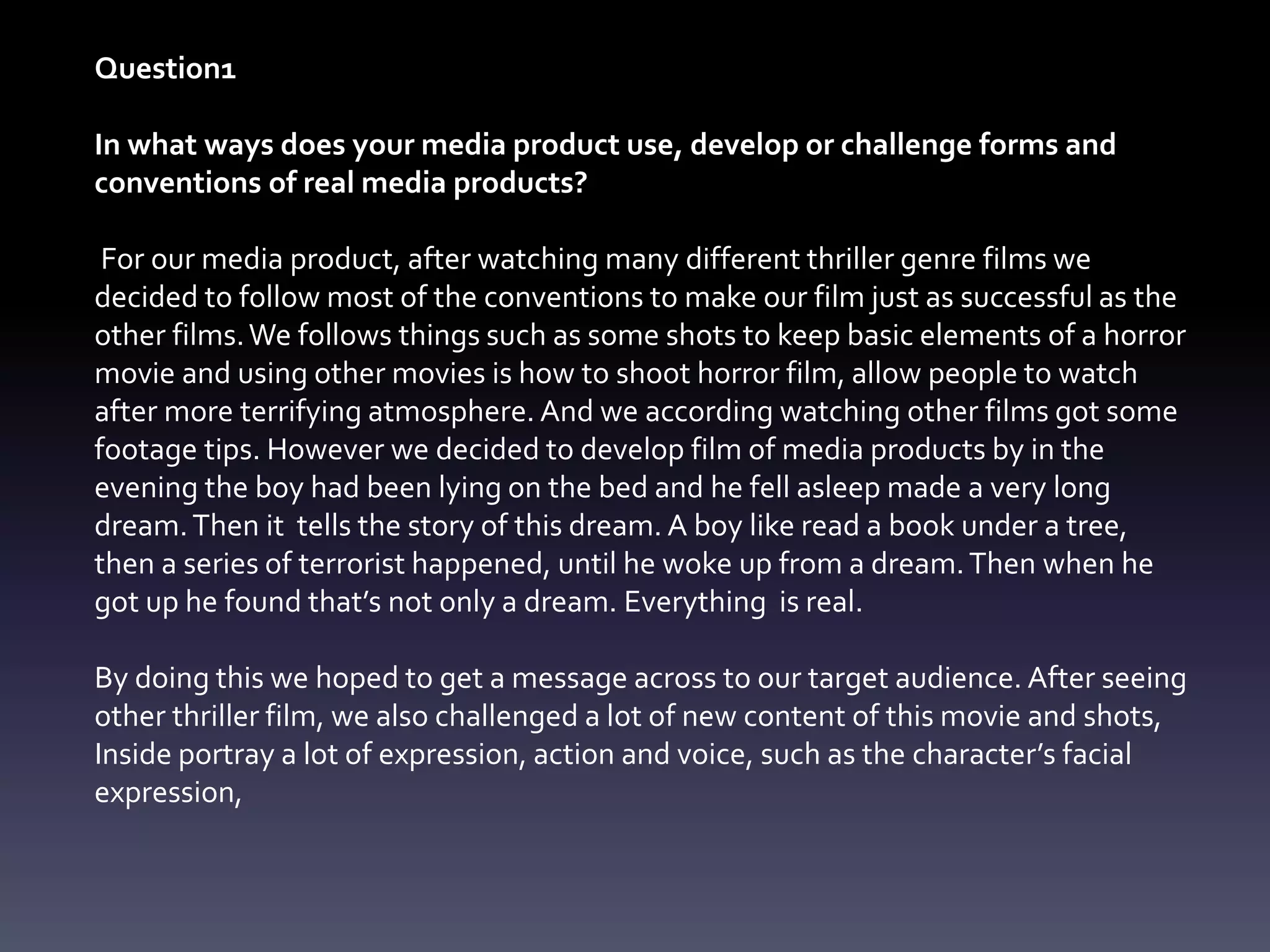 The document discusses the process of creating a horror film for a class project. It begins by outlining how the film follows horror film conventions but also aims to develop the genre by having the story unfold as a dream within a dream. It then discusses how the film represents teenagers and aims to attract this audience through relatable characters and styling inspired by Japanese horror. Techniques learned through the process included various camera shots, sound recording, and how to effectively portray atmosphere and characters. The document reflects on how working collaboratively and learning from other films helped improve their understanding of film analysis, production, and the genre.
