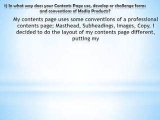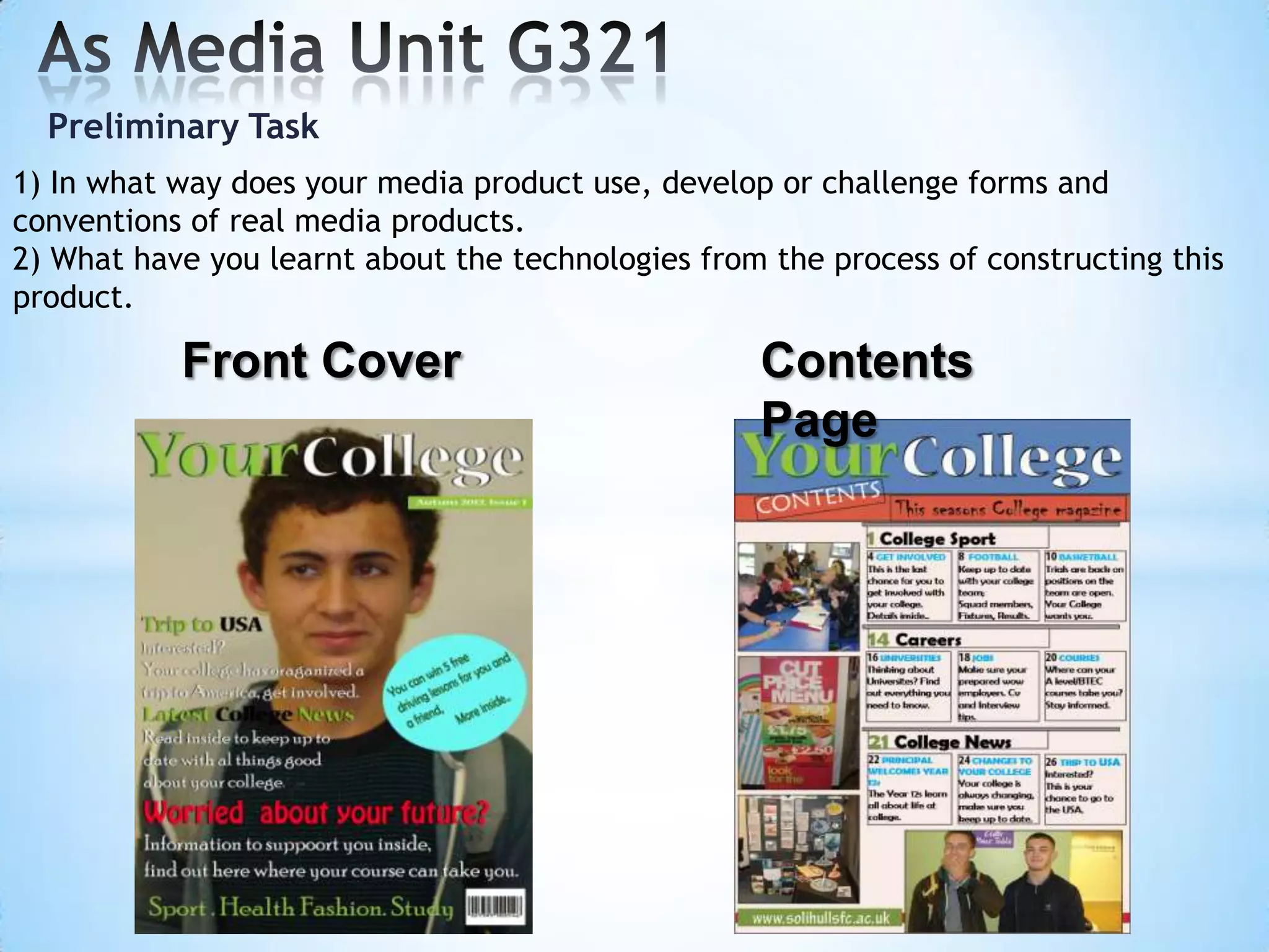 This document discusses the conventions used in the construction of a magazine front cover and contents page for a college magazine as part of a preliminary task. It compares the conventions to a real magazine, Billboard, highlighting similarities and differences in layout, design choices, and image techniques. The document also reflects on what was learned about InDesign, Photoshop, and Blogger from completing the task, including skills like designing pages, using fonts and effects, and uploading work online.