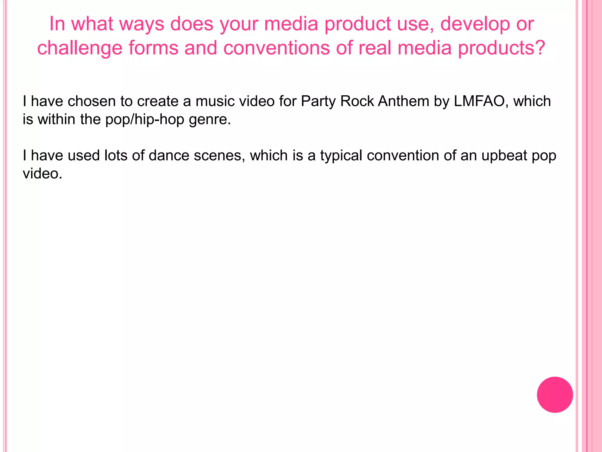 The document discusses how the media product challenges conventions of typical pop music videos. It uses dance scenes as is conventional but challenges the usual glamorous settings and costumes by featuring an ordinary character and everyday locations to seem more down to earth and highlight the bizarreness of the video in a comical way.