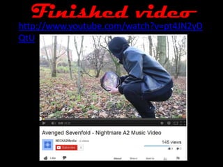 The document discusses the evaluation of a media production project. It describes how new media technologies were used at different stages of the project. During filming, DSLR cameras and tripods were used to capture footage. Poor camera settings on one camera resulted in low quality shots, but these were incorporated into the final video as point-of-view shots. Photoshop was used to edit images and create artwork for promotional materials. Audience feedback on the video was generally positive and highlighted effective elements like the opening sequence, but also noted areas for improvement such as adding more narrative footage.