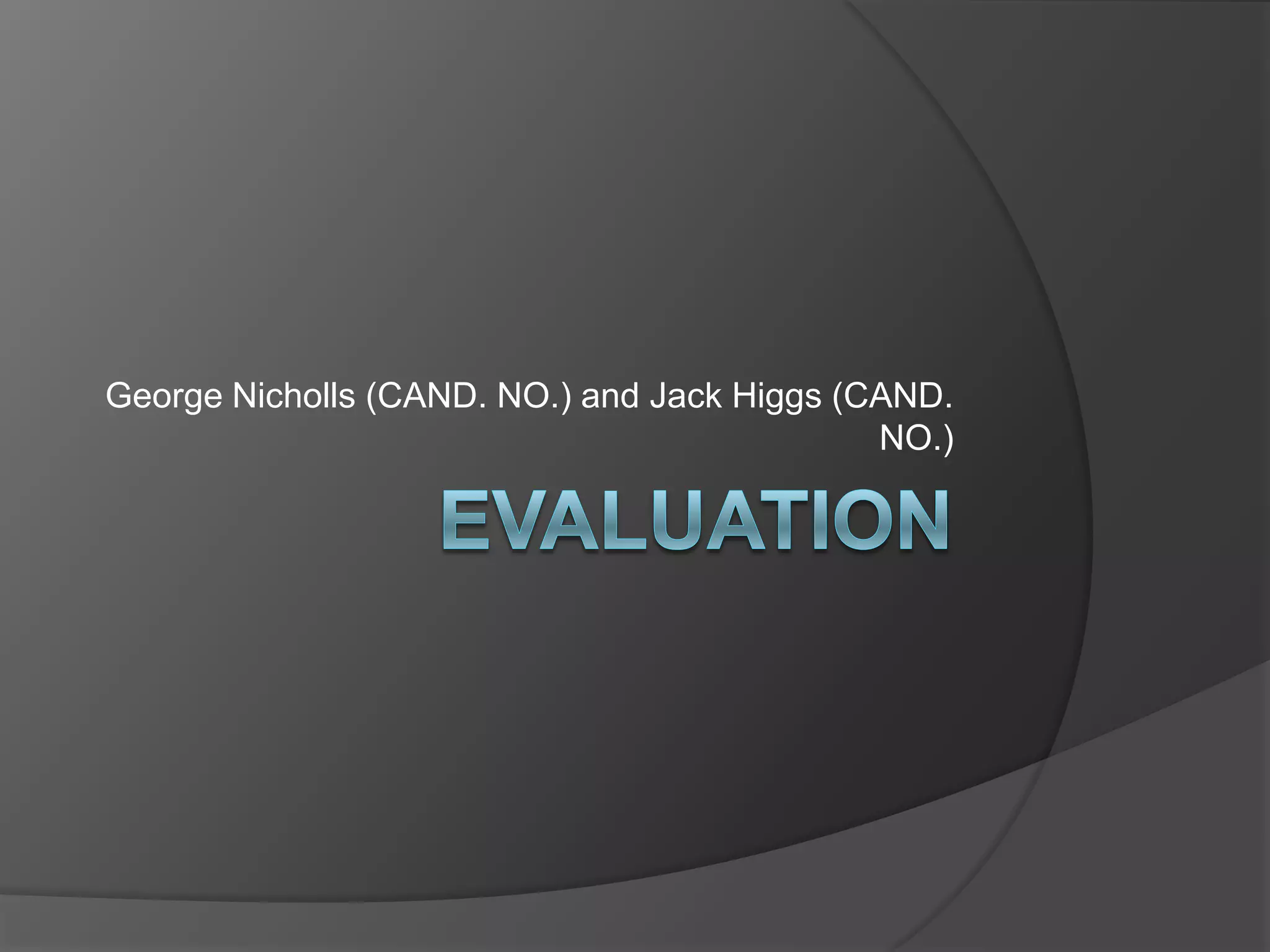 George Nicholls and Jack Higgs submitted an evaluation of their media product, an opening scene for a thriller film. They analyzed 9 frames from the scene that used, developed or challenged conventions of real thriller films. The frames showed elements like an emergency call, a hooded stalking figure, and a character's death. They represented a young male as the sole social group. Their product would be distributed by a major studio targeting middle-aged audiences through techniques like an urgent opening and hints of an unsolved crime.