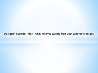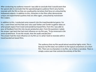 The filmmaker learned several things from audience feedback on their film. Feedback from specialized genre audiences indicated that the films focus on gritty, unconventional subjects and characters that are different from mainstream films. Additional research on travel/wanderlust genres using online platforms provided feedback that audiences want to feel a sense of adventure through visuals, audio, and a feeling of freedom in the films. The filmmaker incorporated this feedback in their pre-production planning. The audience for the film would be niche since it lacks characters, narrative, and consists solely of a voiceover.