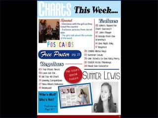 The document provides an analysis and evaluation by Samantha Pople of various magazine covers in order to inform the design of her own music magazine cover. She looks at color schemes, layouts, fonts, and main images on existing covers from magazines like Q, Rolling Stone, and NME. Samantha decides on a 2-4 color scheme with contrasting colors and either bold or pastel hues. She also experiments with editing photos and choosing appropriate fonts and images for her own cover.