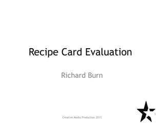 The document summarizes the design choices for recipe cards targeted at both adult and child audiences. For the adult cards, a simple layout with a 60:40 image to text ratio was used, similar to existing recipe cards. The child cards feature cartoon graphics inspired by the recipes' main vegetables to make them fun and child-friendly. Color schemes were based on the vegetables' natural hues to convey a sense of freshness. Both card designs aim to appeal to their intended audiences through visual elements while also maintaining consistency as part of a set.