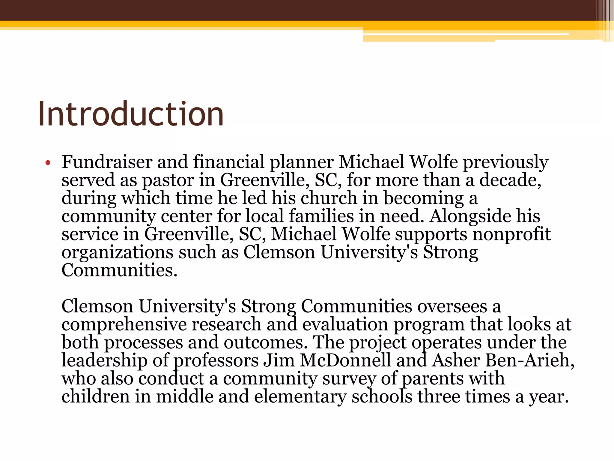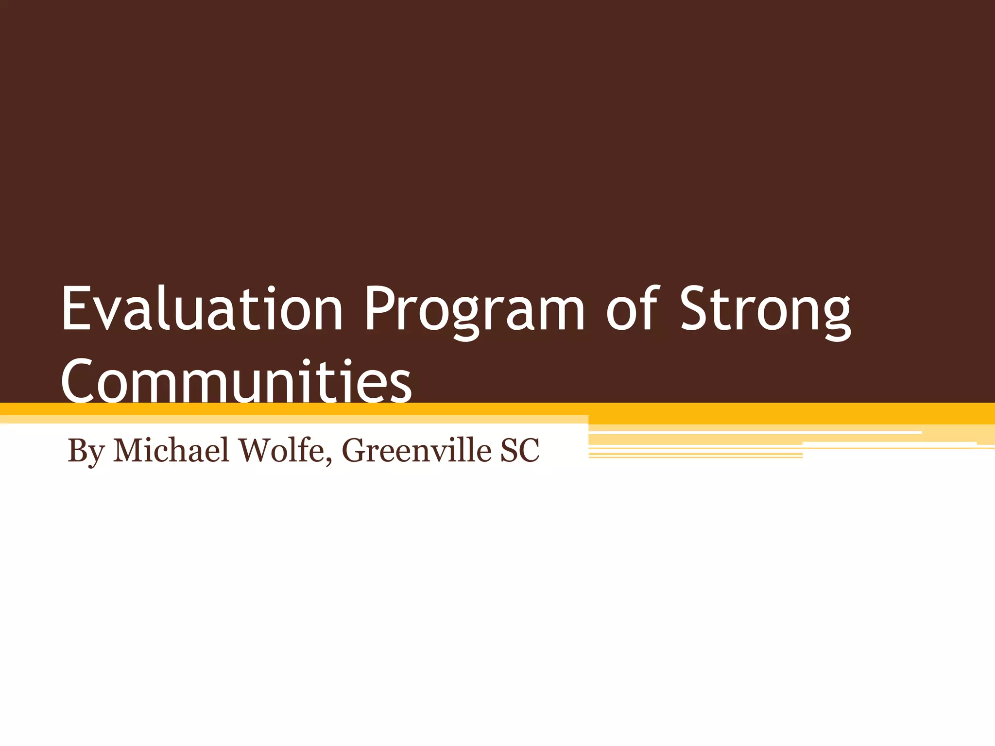 Clemson University's Strong Communities program oversees a comprehensive research and evaluation program that examines both processes and outcomes. The program is led by professors Jim McDonnell and Asher Ben-Arieh, who conduct community surveys of parents with children in middle and elementary schools three times a year. Strong Communities aims to provide support services to families with young children to prevent child maltreatment. The Strong Communities evaluation covers 10 areas through studies of processes like organizational involvement and volunteers, and outcomes such as a neighborhood observation study, school and family study, and child injuries and illness study.