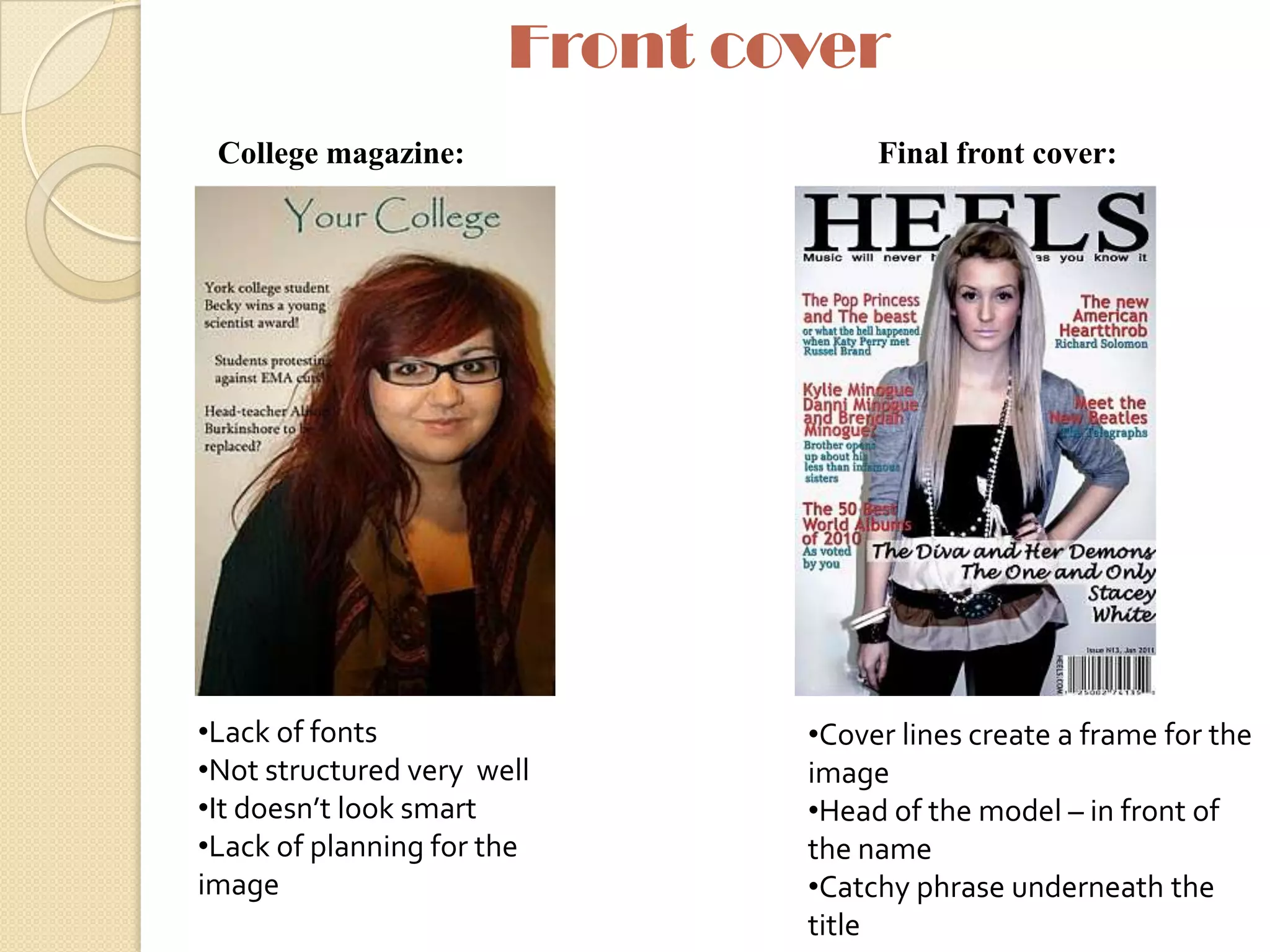 The document compares the student's preliminary college magazine to their final magazine project. They learned that planning is essential, as their preliminary magazine lacked structure and planning. Their final magazine benefited from thorough planning, including sketches and layout plans. The student also gained photography skills, like managing lighting and using photo editing tools. Overall, their final magazine showed significant improvement in design, structure, and professionalism compared to their earlier preliminary work.