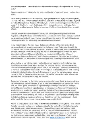 The document discusses the effectiveness of combining a main media product (a movie trailer) with ancillary texts (a magazine cover and poster). Key elements like costume, colors, fonts, and characters were carried throughout all three products to create cohesion and link them together. Audience testing showed the combination was successful, with viewers identifying connections between the products. Specifically, a white mask featured prominently in all three works to tie them together and create intrigue around the main character. Limiting colors to black, white, and red also helped bind the products and genre. Similar fonts further reinforced the connections.