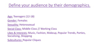 The document defines the target audience for feedback as teenage girls and discusses methods used to gather feedback, including questionnaires, interviews, surveys, and comments on websites and YouTube. Rough cuts of a music video, digipak, and website were feedback, focusing on addressing negatives to improve the products. Final feedback was gathered through a questionnaire to evaluate how the final products were received and could still be improved.