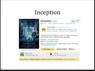 The document discusses the film "Inception" and how it portrays an alternative reality through dreams that could be seen as preferable to real life. It then discusses a short film the author created that was loosely based on similar concepts from "Inception." The short film is about a man named Carter Evans whose reality is confusing and may not be what it seems. The document provides details about various aspects of the author's short film, including its budget, characters, use of everyday situations, marketing techniques, poster design conventions, and a fictional film review magazine article.