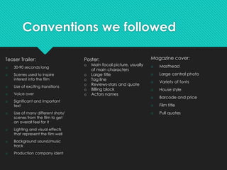 The document discusses how a media product followed conventions of real trailers, posters, and magazines while also challenging some conventions. It summarizes the key conventions used in a teaser trailer like scenes inspiring interest, transitions, voiceover, and music. It also discusses conventions used in the magazine cover and poster like large photos, fonts, reviews. Some conventions were challenged, like the timing of the production company ident in the trailer and elements on the poster and magazine cover. Overall the document analyzes how the media product balanced following real conventions with some original challenges to those conventions.