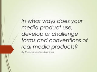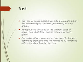 The document outlines the creation of a short romantic film titled 'Raja Rani' by a group of students, emphasizing their use and adaptations of media conventions and techniques. It discusses roles, locations, story ideas, and the methodology behind their editing choices, particularly their innovative reverse editing style to challenge typical romance film conventions. The film’s costumes also blend traditional Indian attire with casual wear, showcasing a deliberate choice to challenge norms within the genre while aiming for a fresh narrative approach.